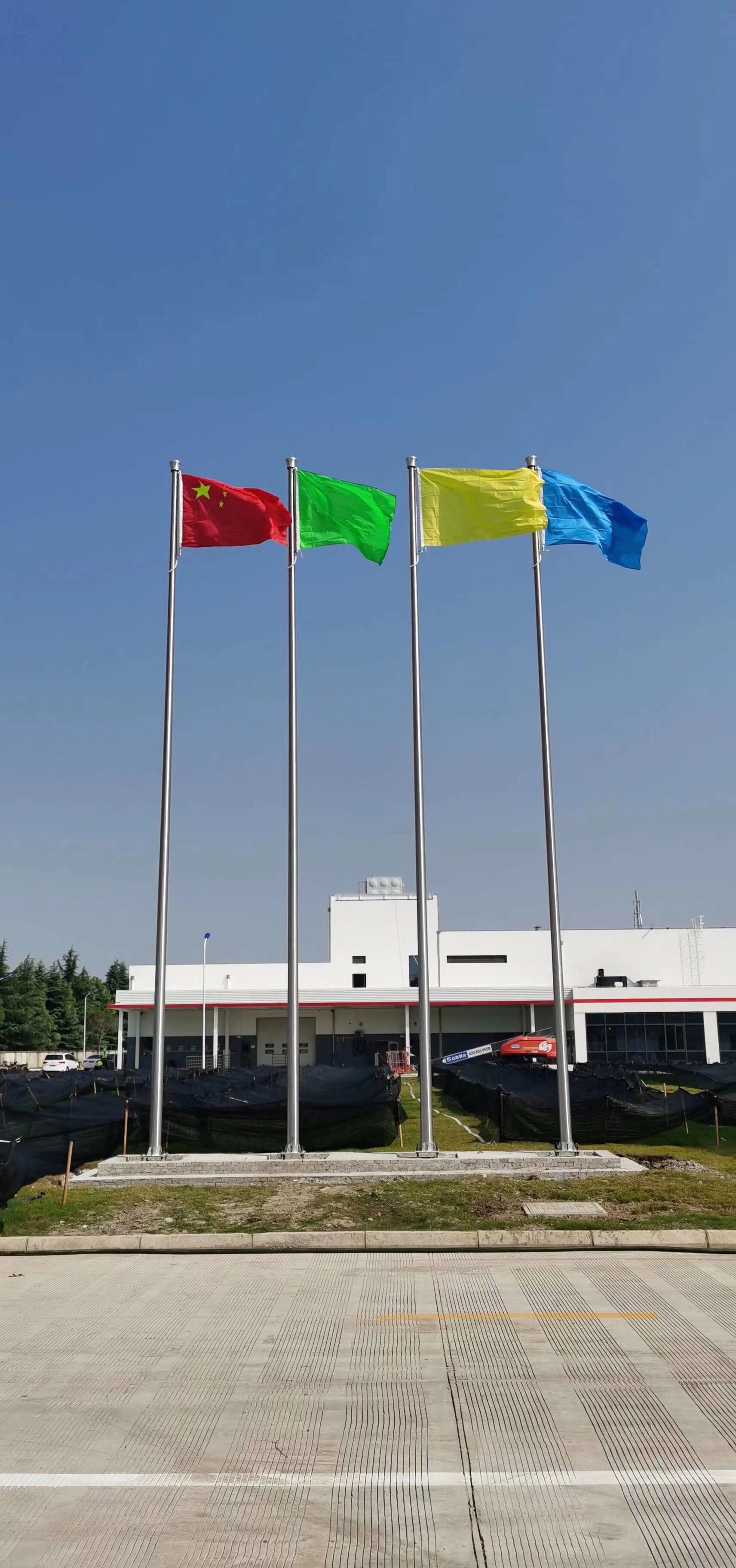 屬于多個旗桿,包括三個旗桿,五個旗桿等。根據《國旗法》第7條:國慶日,國際勞動節,元旦和春節,各級國家機構和人民組織應顯示國旗。國慶假期必須懸掛所有國旗。在多個旗桿上懸掛國旗的方法是:最高旗桿比其他旗桿大一個。如果中間旗桿較高,而兩個旗桿較短,則方法是使中間旗桿比兩個旗桿大一號。旗桿和旗桿之間的左右距離約為100cm,中間的旗桿比兩側高50cmm。